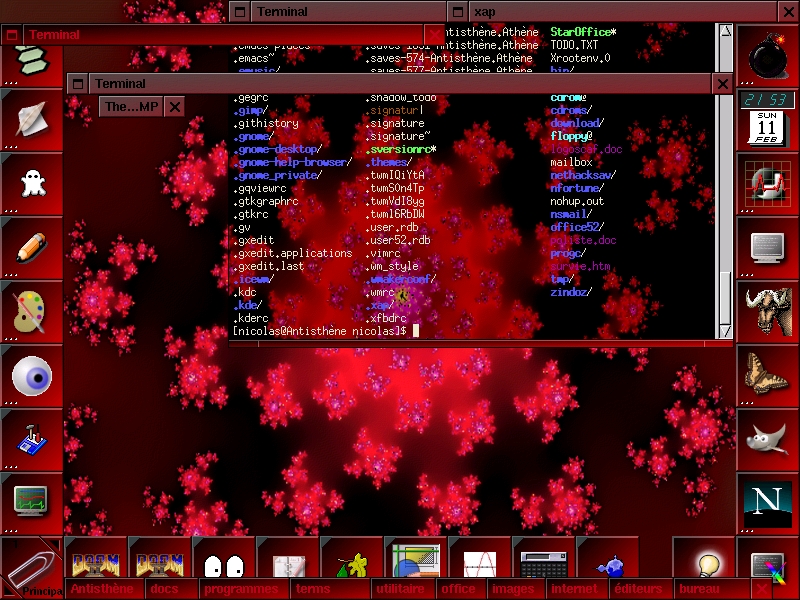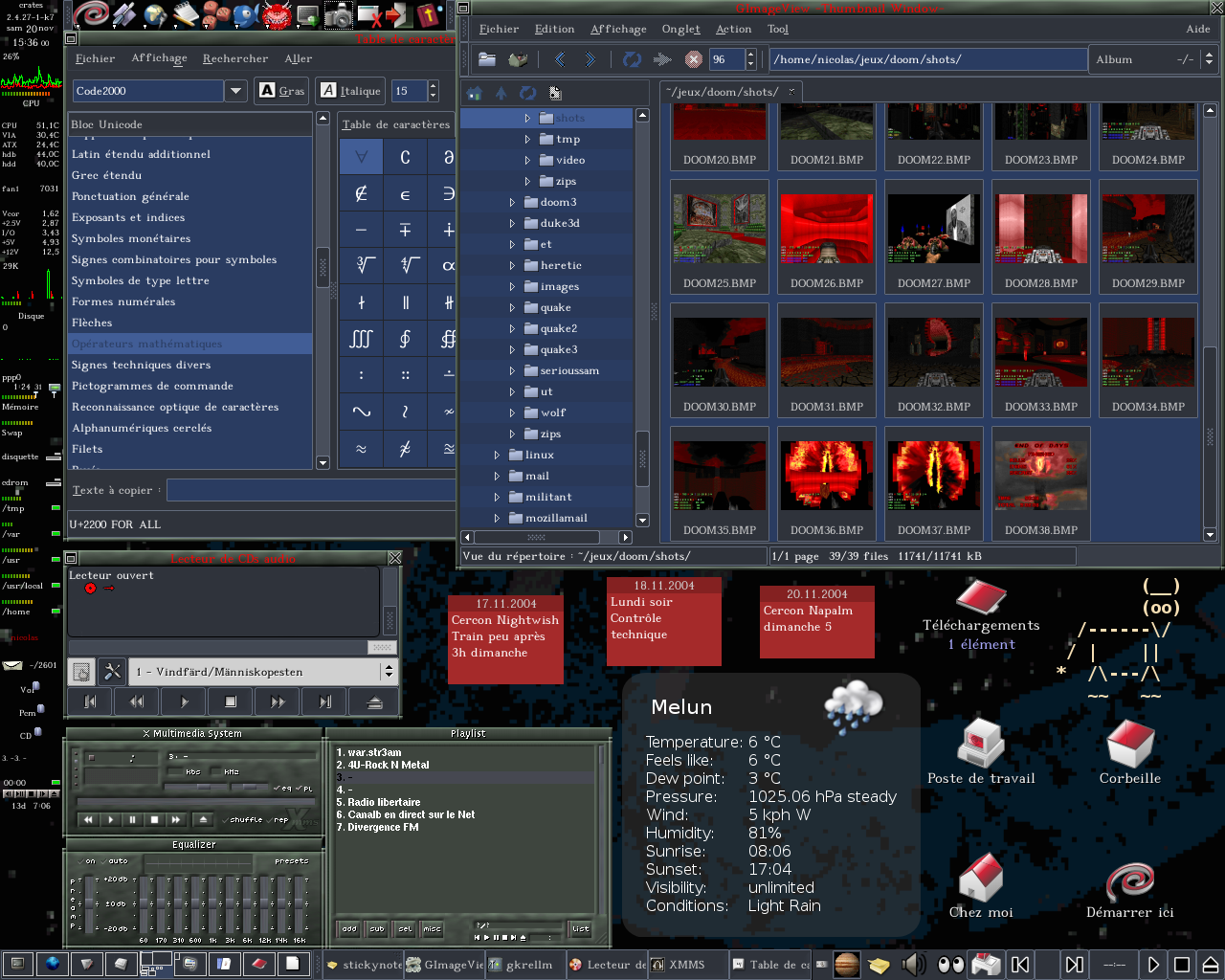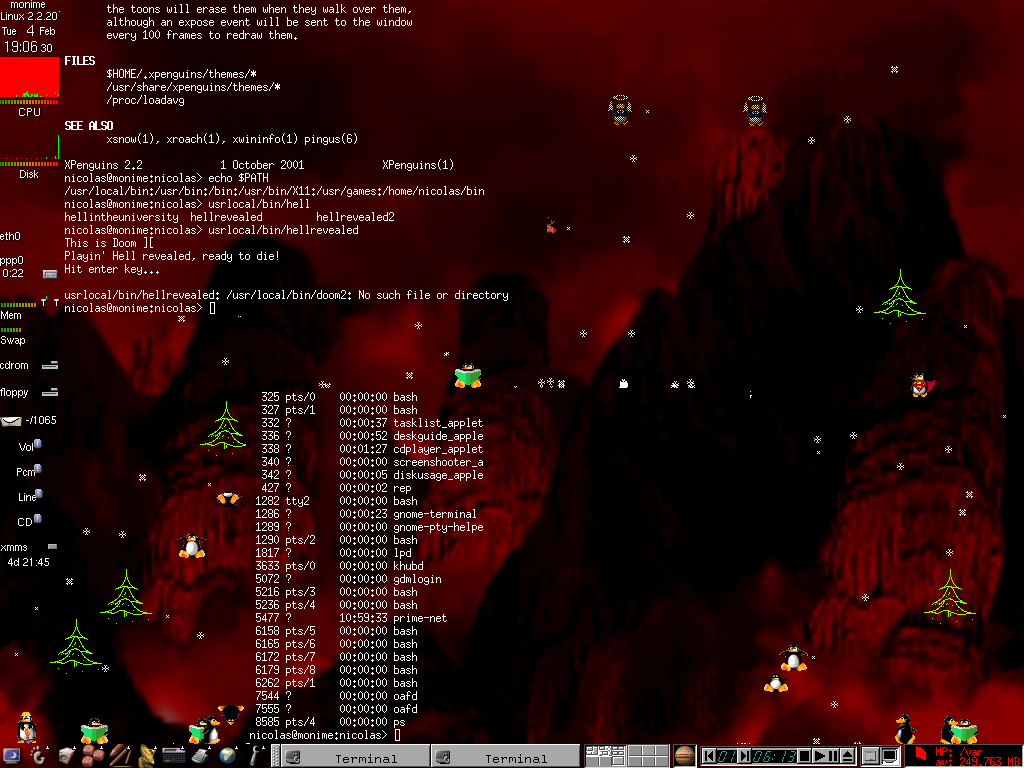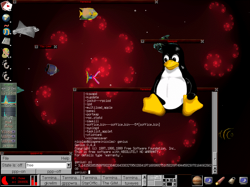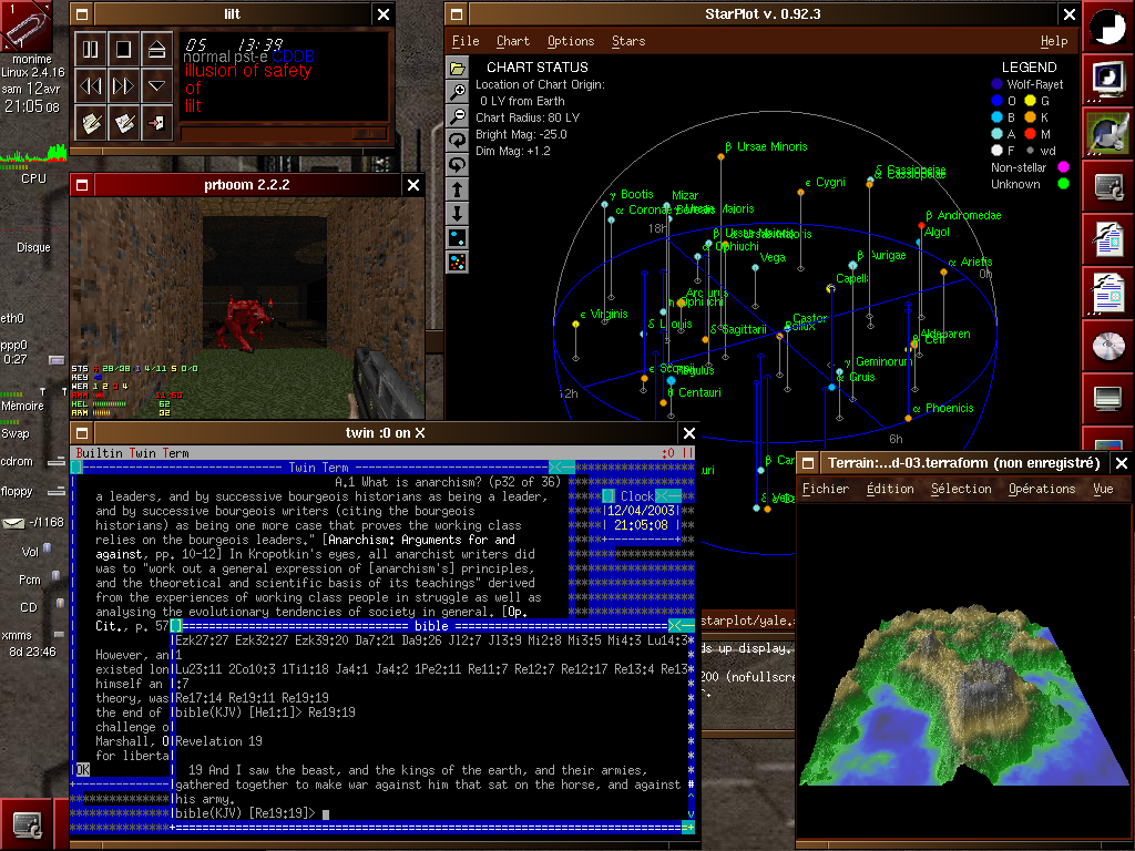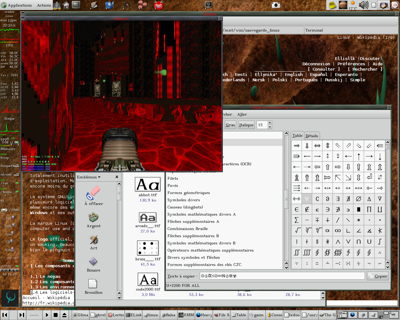 - Pareil mais avec xfishtank en fond, pstree et genius dans la console et tuxeyes ; doom, doom][, quake et quake 2 marchent,