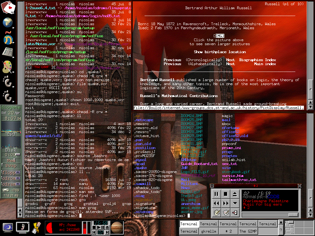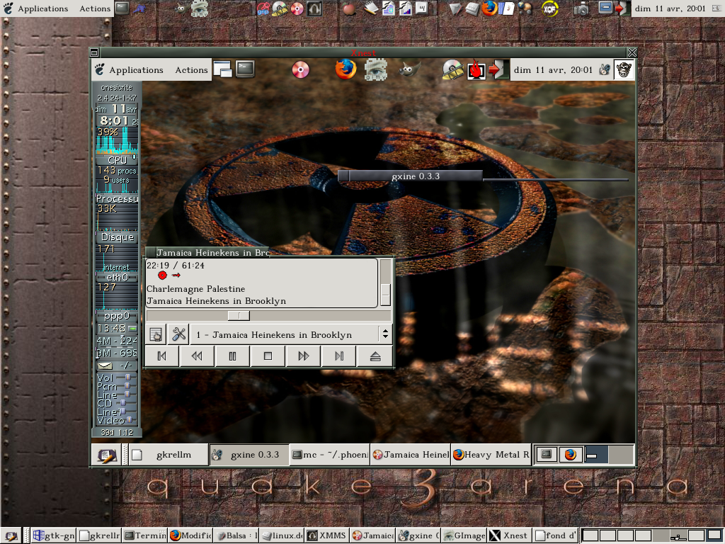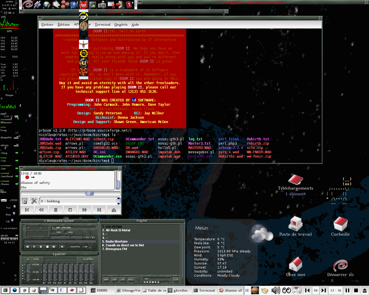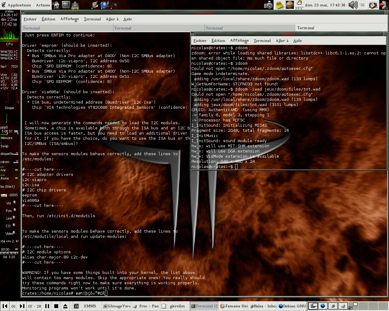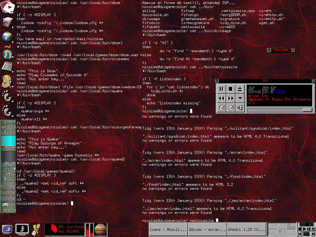 - Pareil mais avec xfishtank en fond, pstree et genius dans la console et tuxeyes ; doom, doom][, quake et quake 2 marchent,