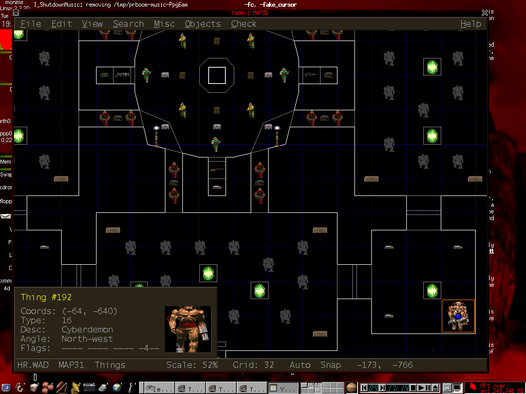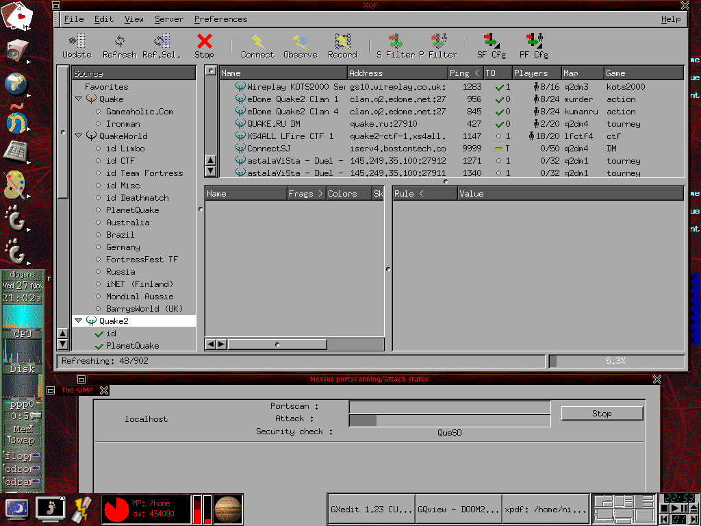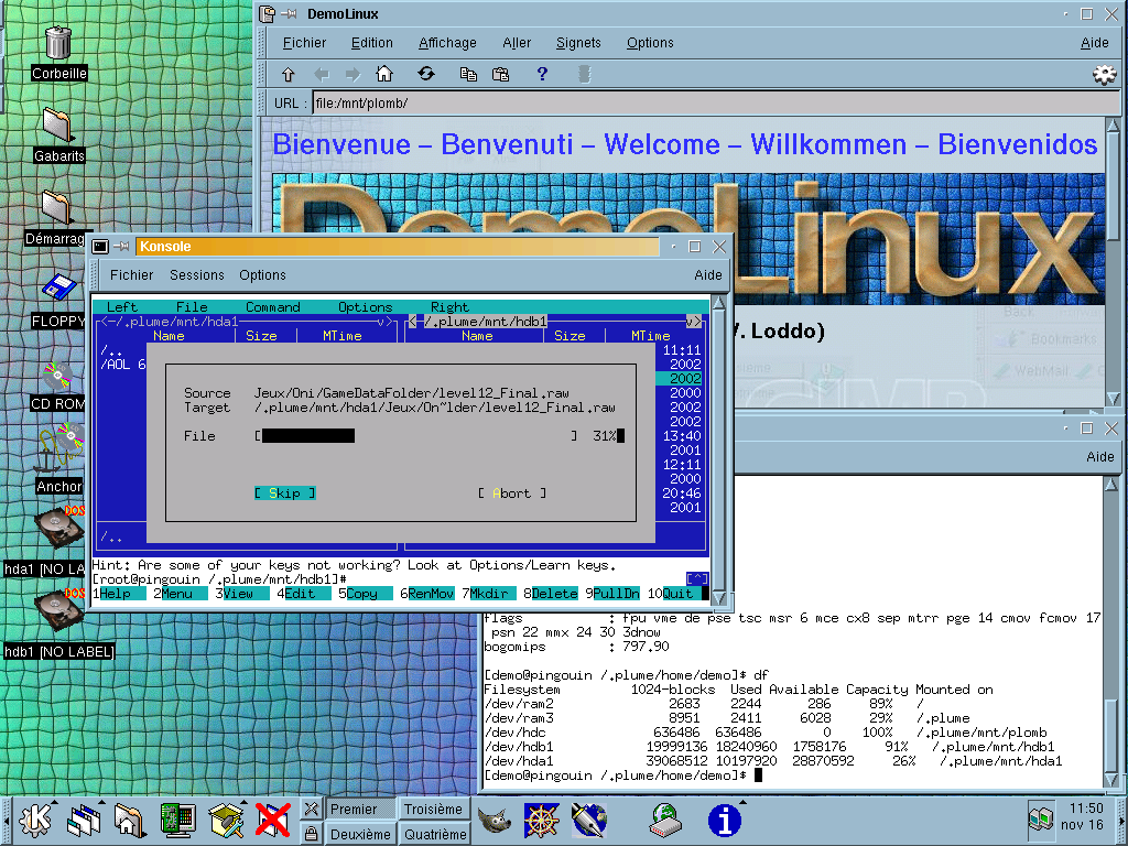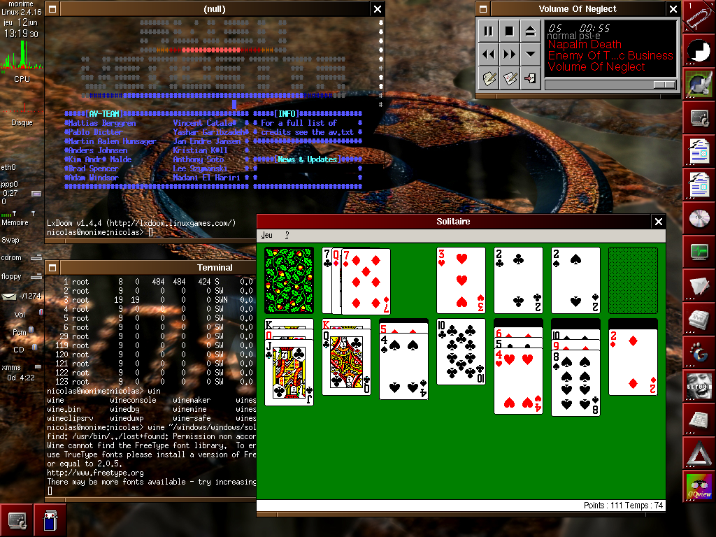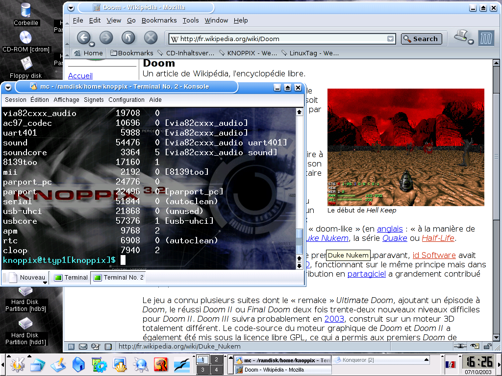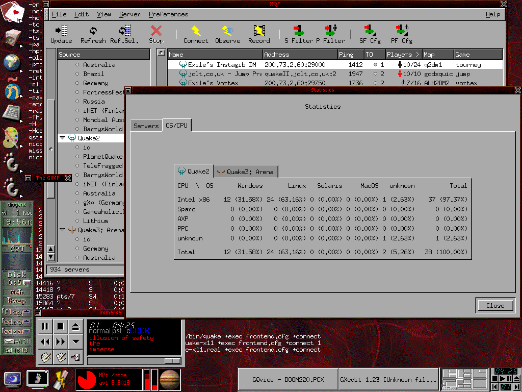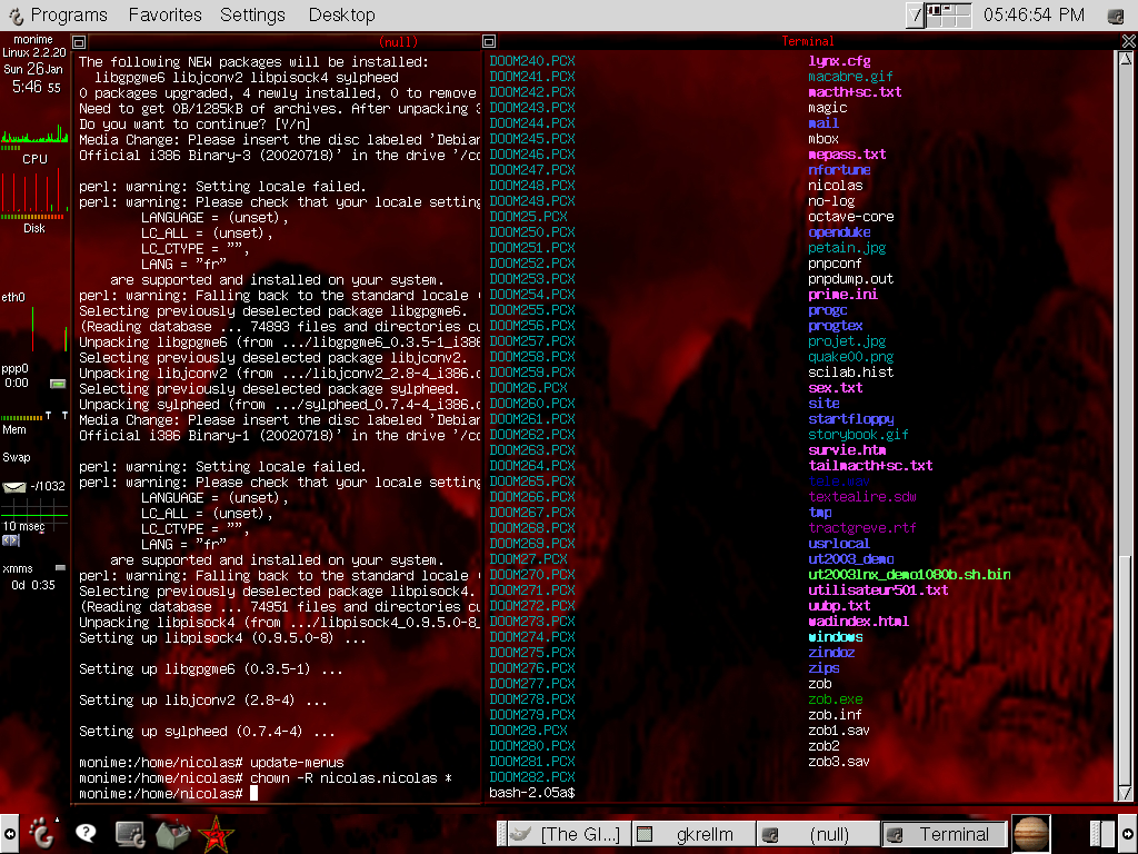 - Pareil mais avec xfishtank en fond, pstree et genius dans la console et tuxeyes ; doom, doom][, quake et quake 2 marchent,