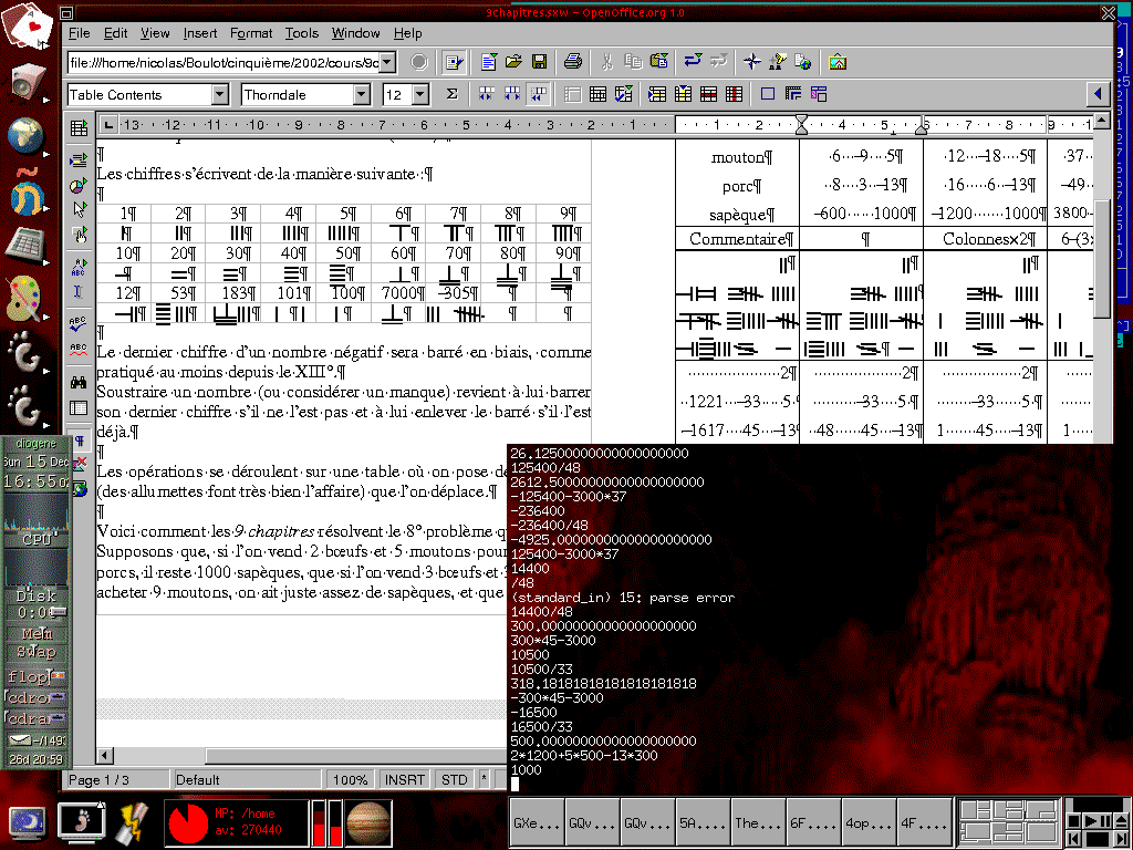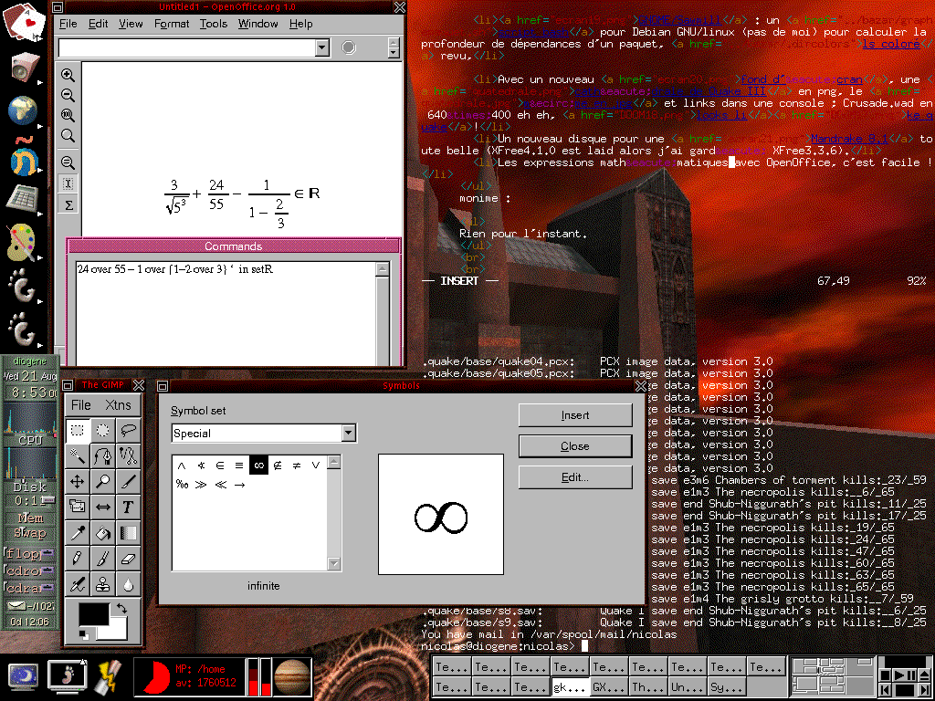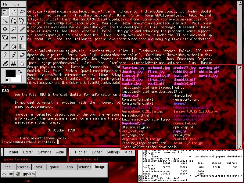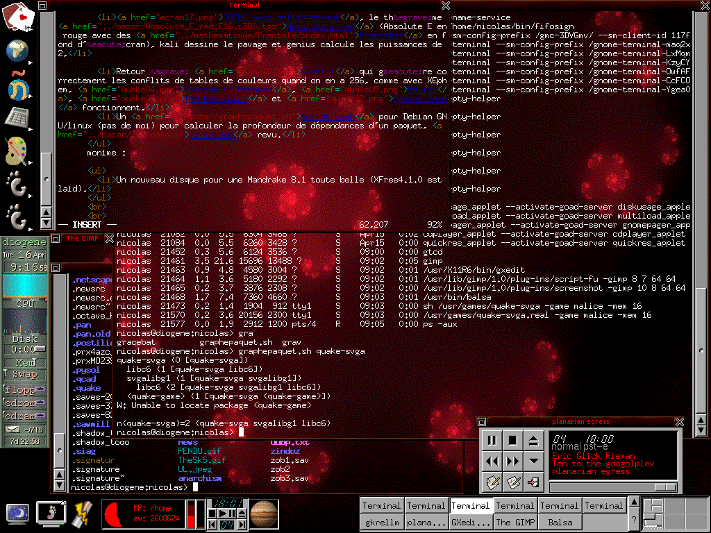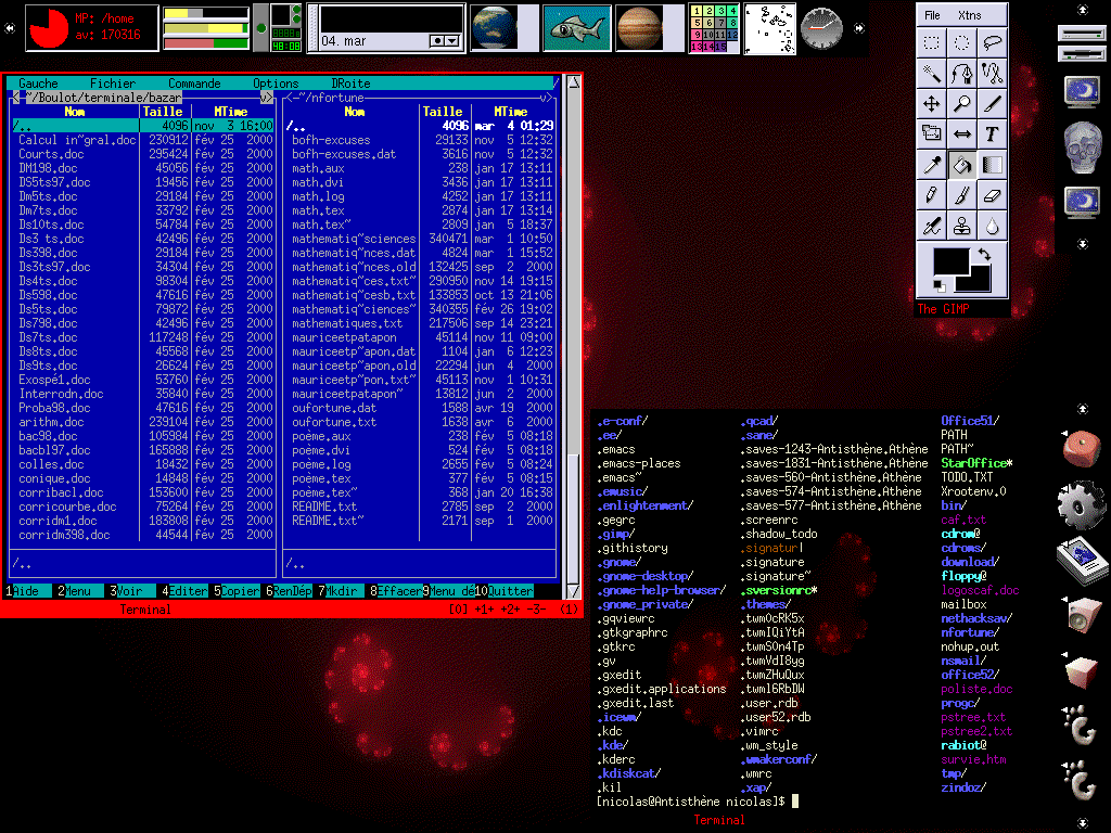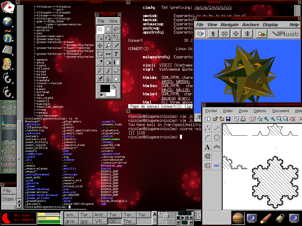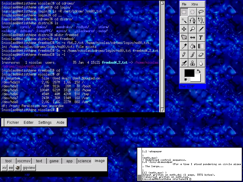 - La Mandrake 6.02 avec larswm, LaTeX dans la console blanche, The Gimp pour la capture et xap, 800×600 et 65536 couleurs,