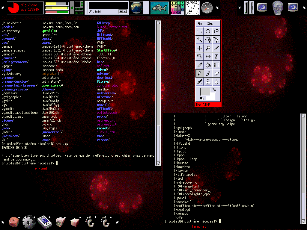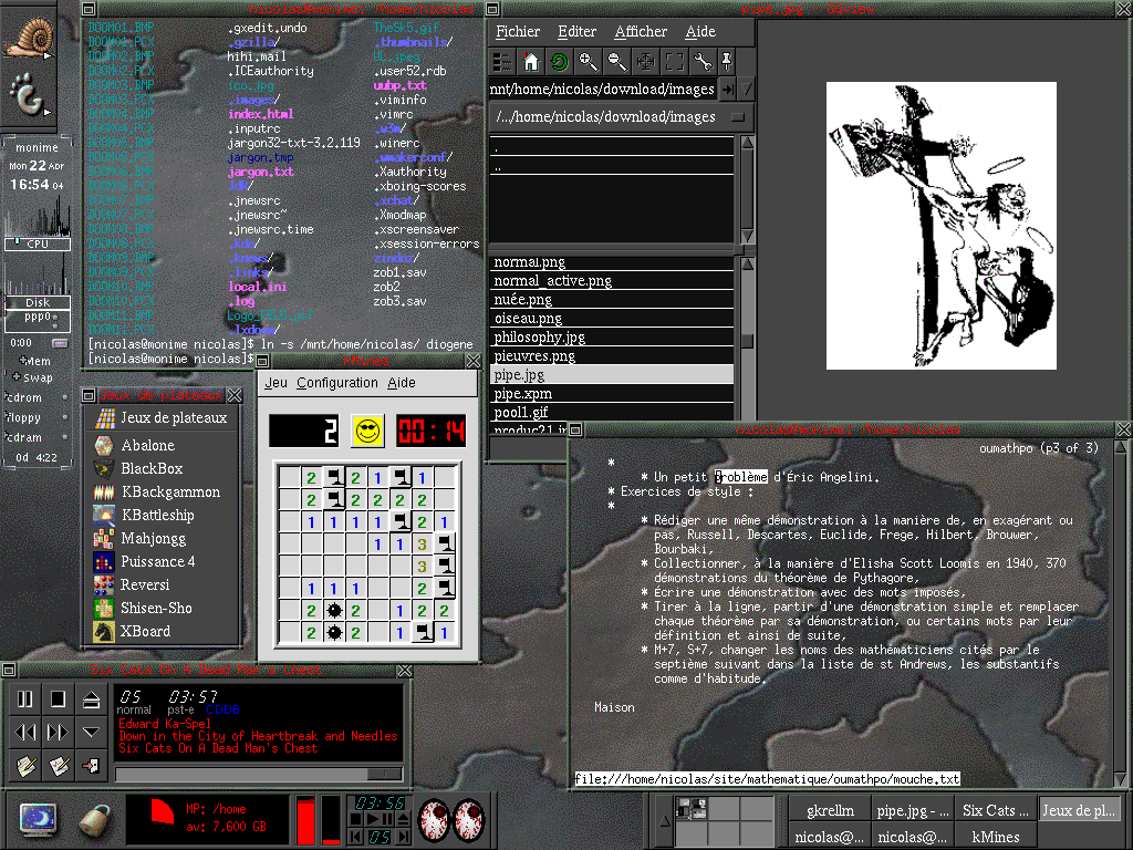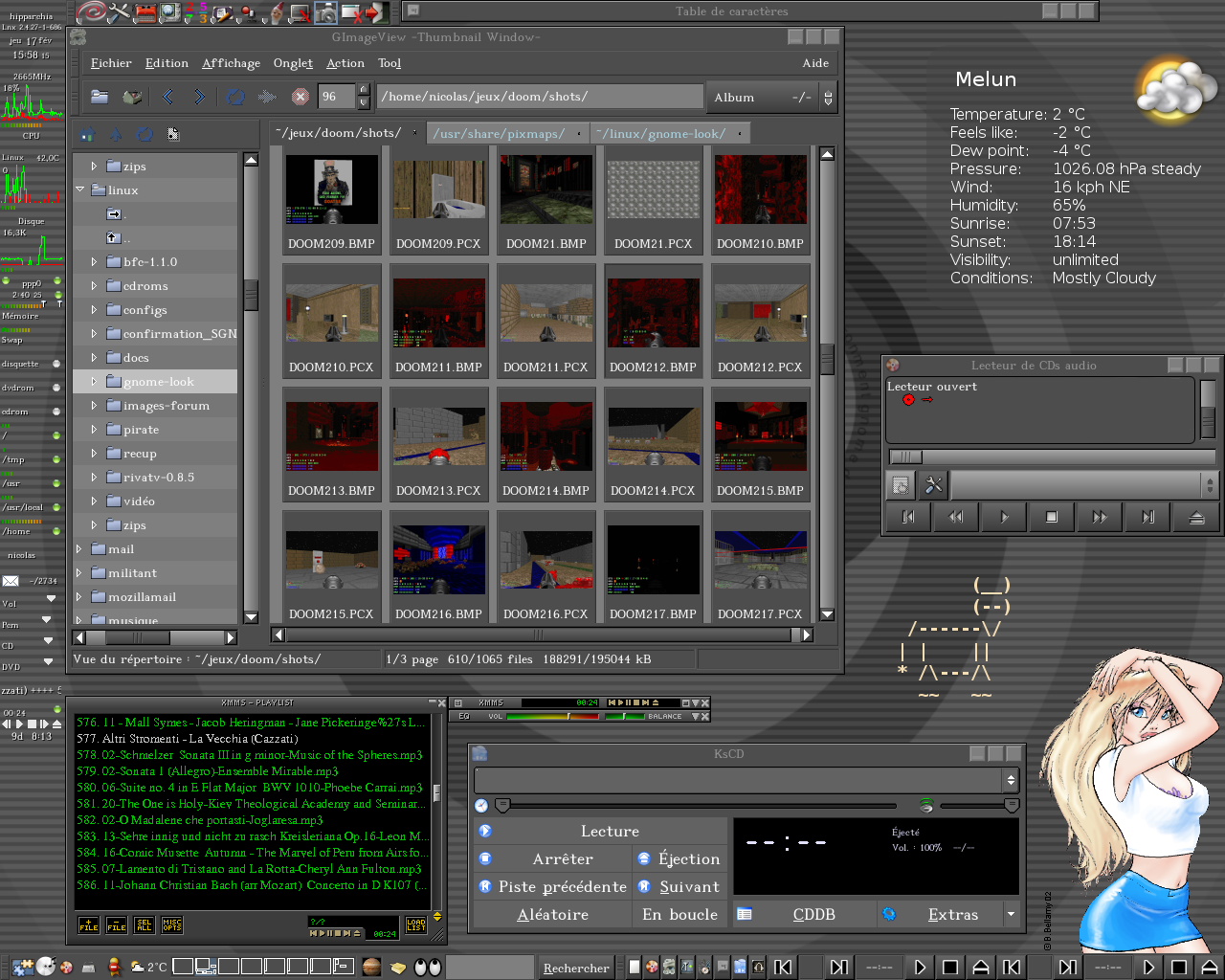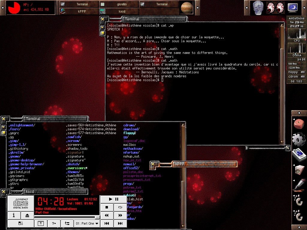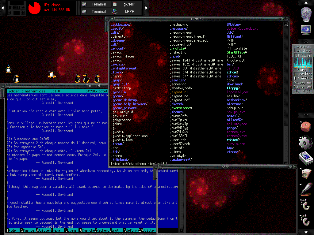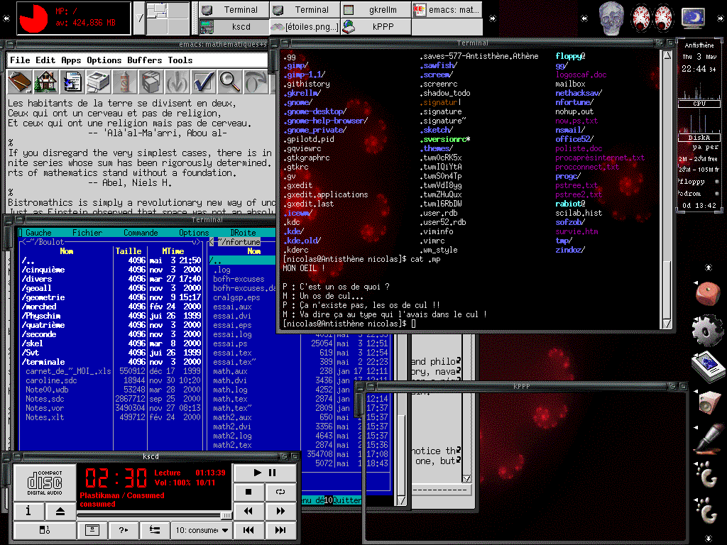 - Le même avec en plus xemacs éditant mathematiques+sciences, kscd et gkrellm a le thème transparent, .mp me donne des citations quand je veux,
