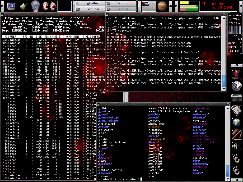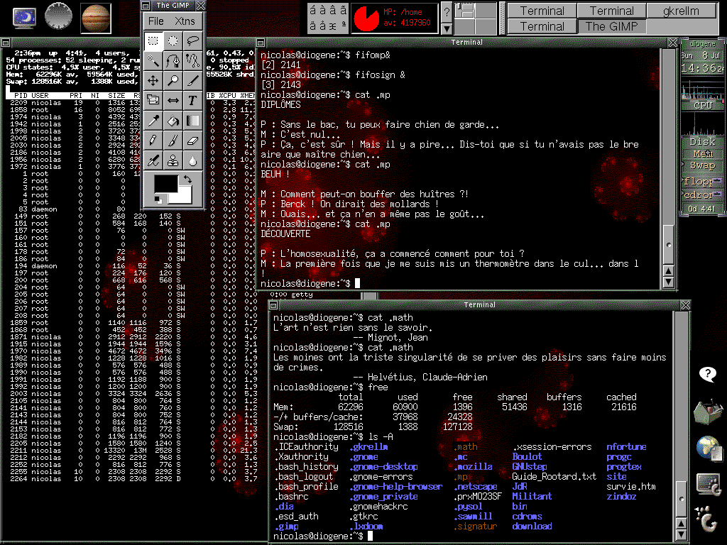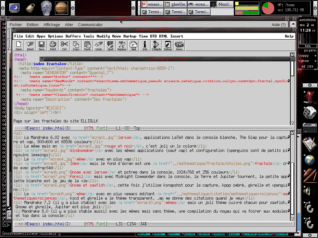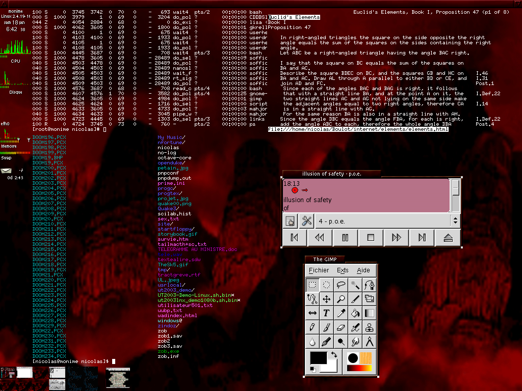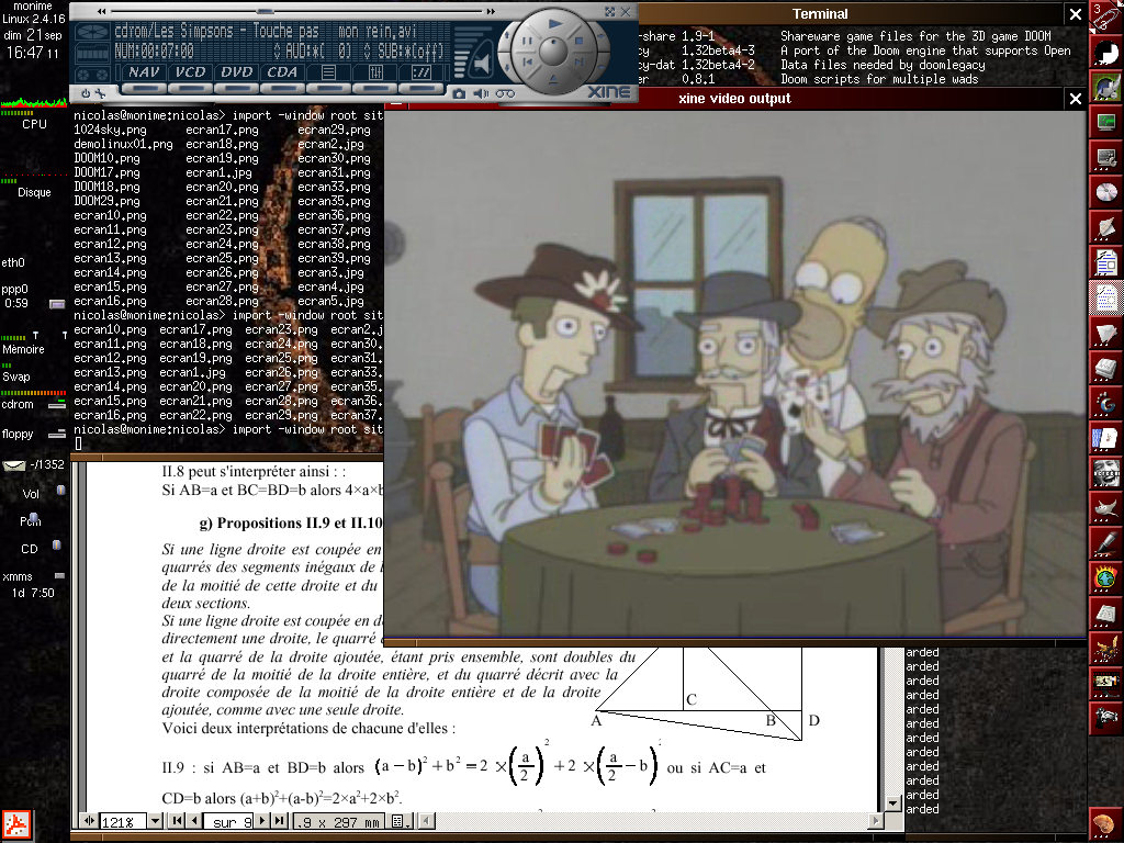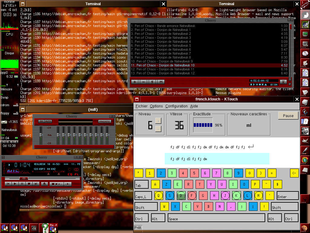 - Le même avec en plus xemacs éditant mathematiques+sciences, kscd et gkrellm a le thème transparent, .mp me donne des citations quand je veux,