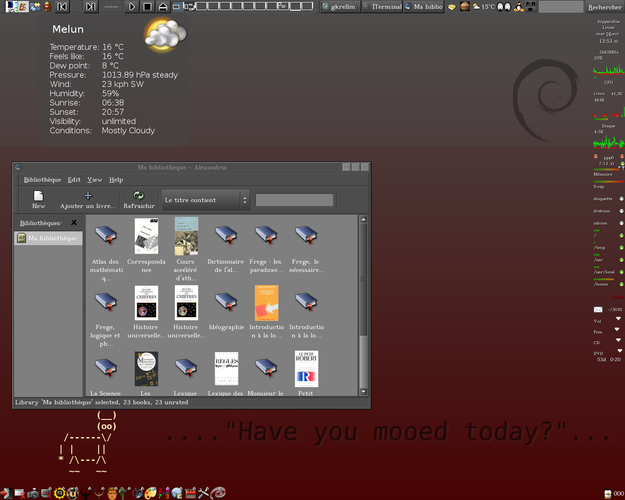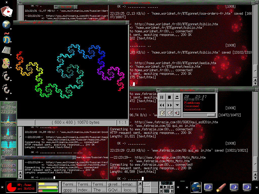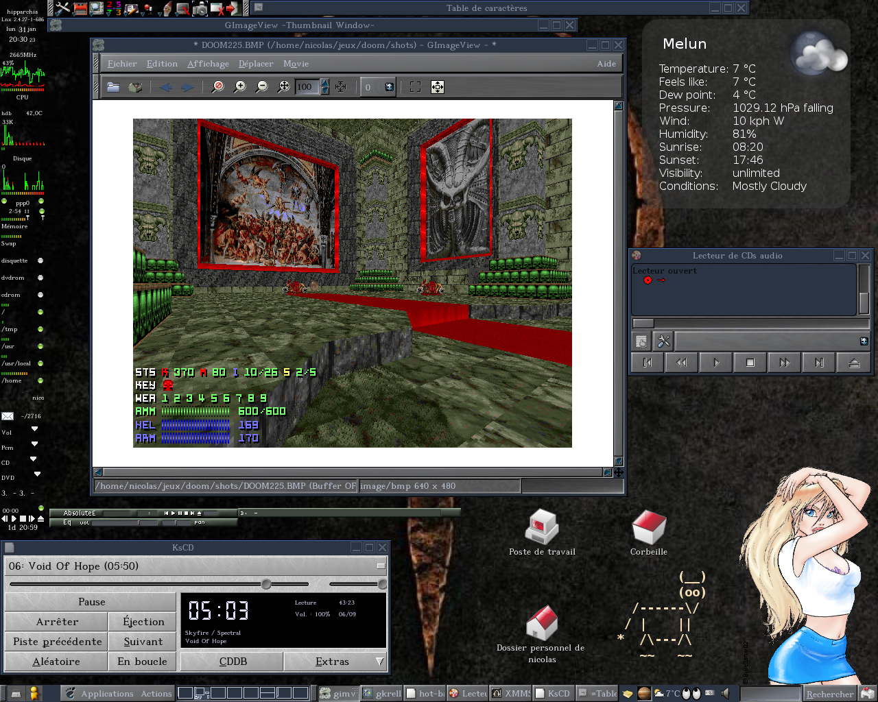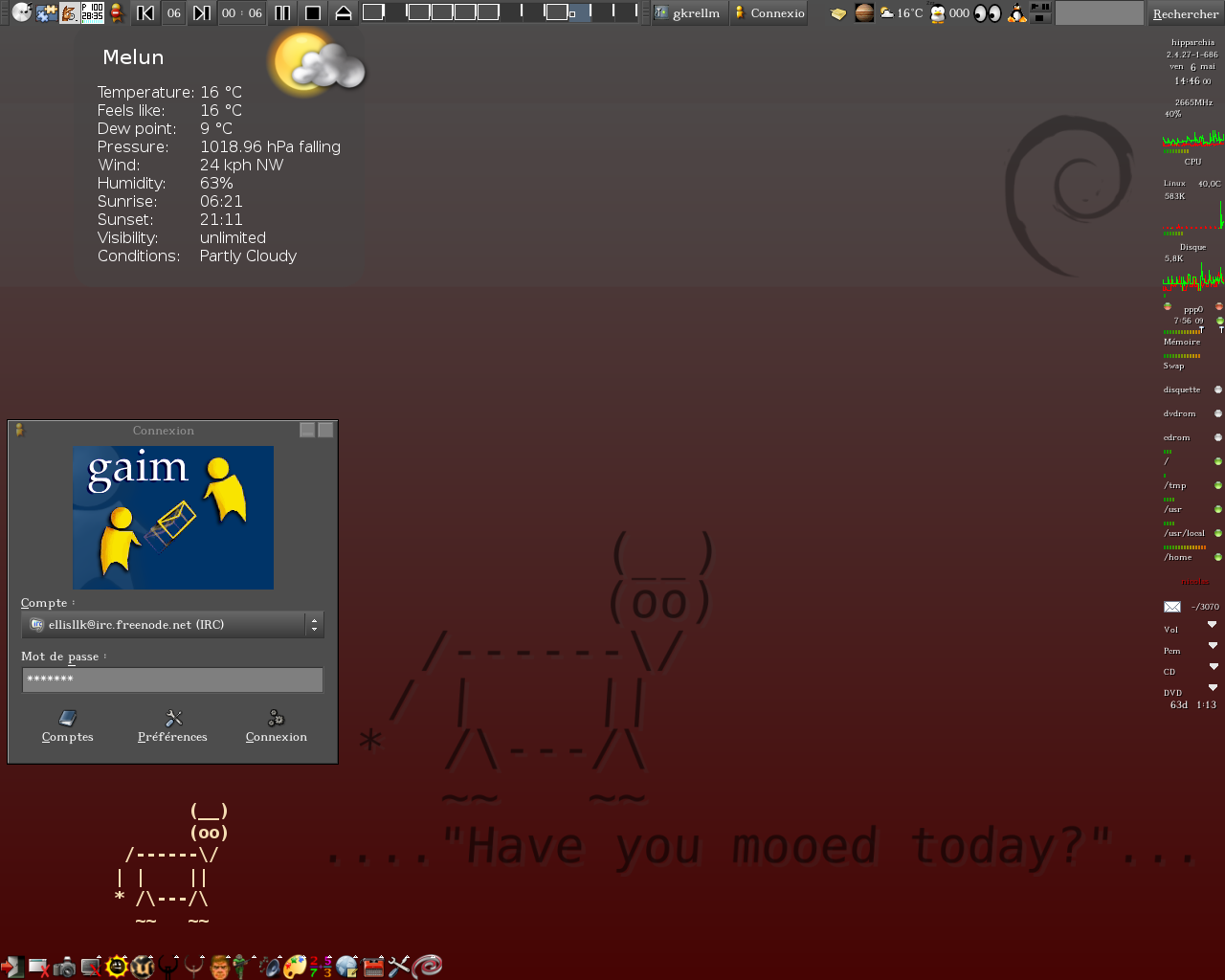 - Le même avec en plus xemacs éditant mathematiques+sciences, kscd et gkrellm a le thème transparent, .mp me donne des citations quand je veux,