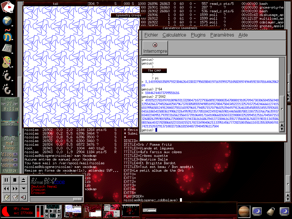 - GNOME avec enlightenment, le thème Absolute E Red (Absolute E en rouge avec des fractales en fond d'écran), kali dessine le pavage et genius calcule les puissances de 2,